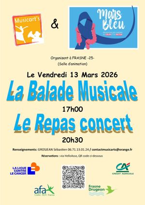 Dans le cadre de Mars Bleu, l’École de Musique Musicart's a le plaisir de vous proposer une balade musicale suivie d'un repas Concert avec Loumwé puis soirée dansante animée par un DJ.