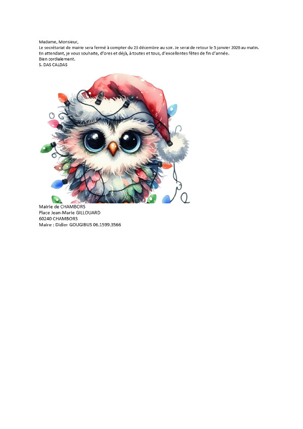 Le secrétariat de mairie sera fermé à compter du 22 décembre au soir et sera de retour le lundi 5 janvier au matin.