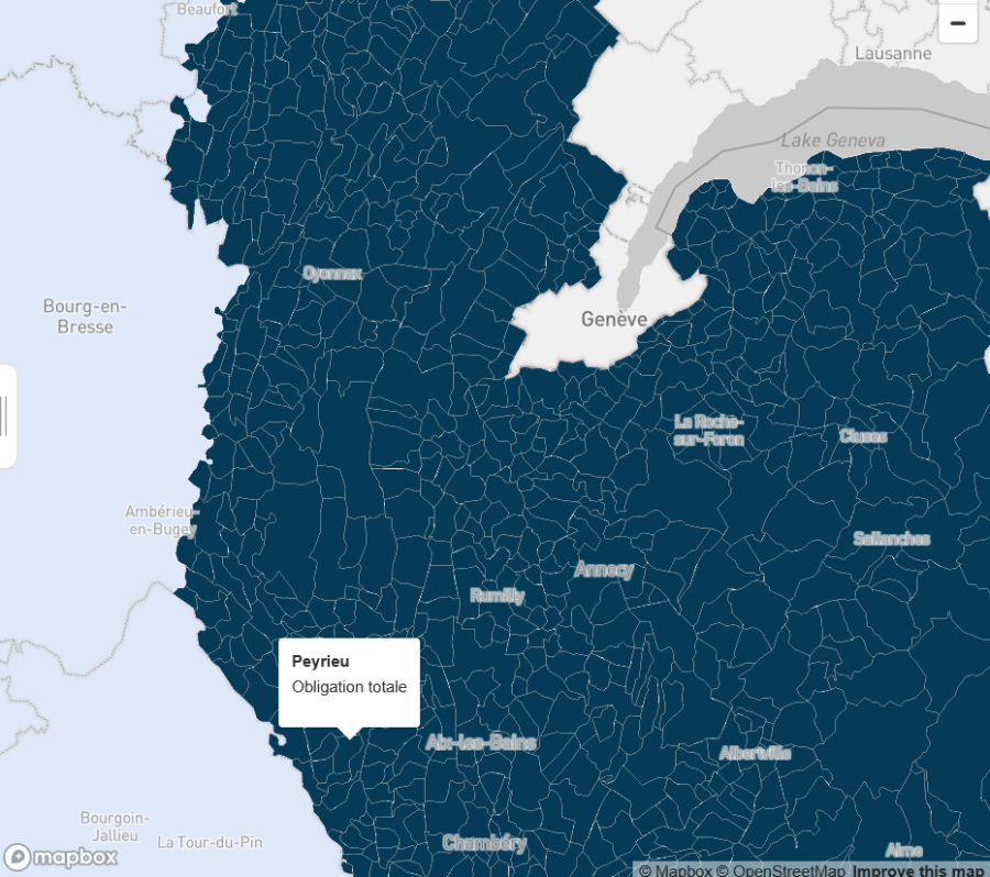 (toutes les zones en bleu foncée sont en obligation hivernale totale)