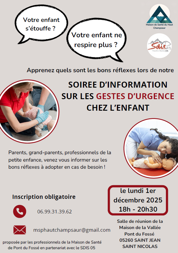Les médecins et professionnels de santé de la Maison de Santé de Pont du Fossé vous proposent en partenariat avec le SDIS 05 une soirée d'information sur les Gestes de Secours chez l'Enfant.