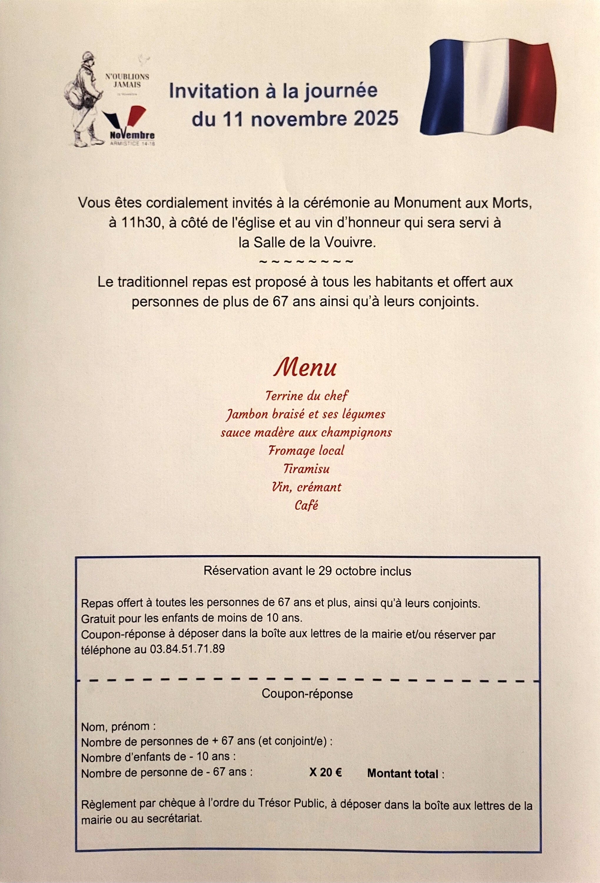 Afin de favoriser les liens entre villageois et villageoises, toute personne de moins de 67 ans peut s'inscrire à ce repas avec une participation de 20,00 €.