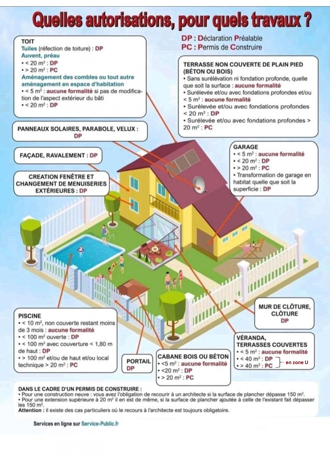 💡 Selon l’importance des travaux, il faut déposer un permis (permis de construire, d’aménager, de démolir) ou une déclaration préalable.
