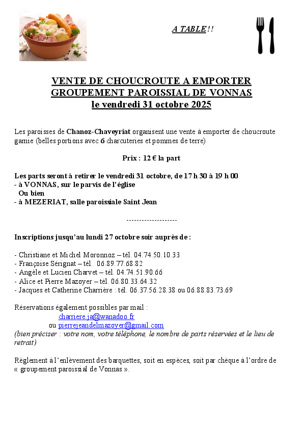 Les paroisses de Chanoz-Chaveyriat organise une vente de choucroute