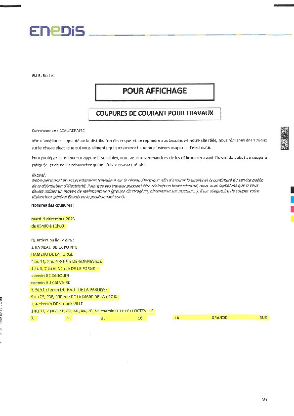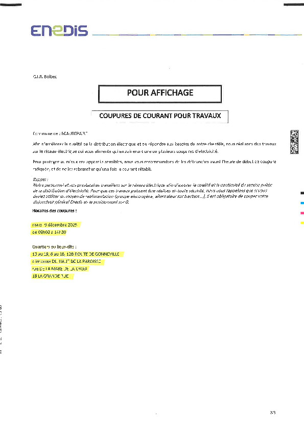 Enedis nous informe des coupures de courant pour travaux le mardi 9 décembre 2025 de 9h à 14h30 pour les secteurs inscrits sur les courriers ci joint