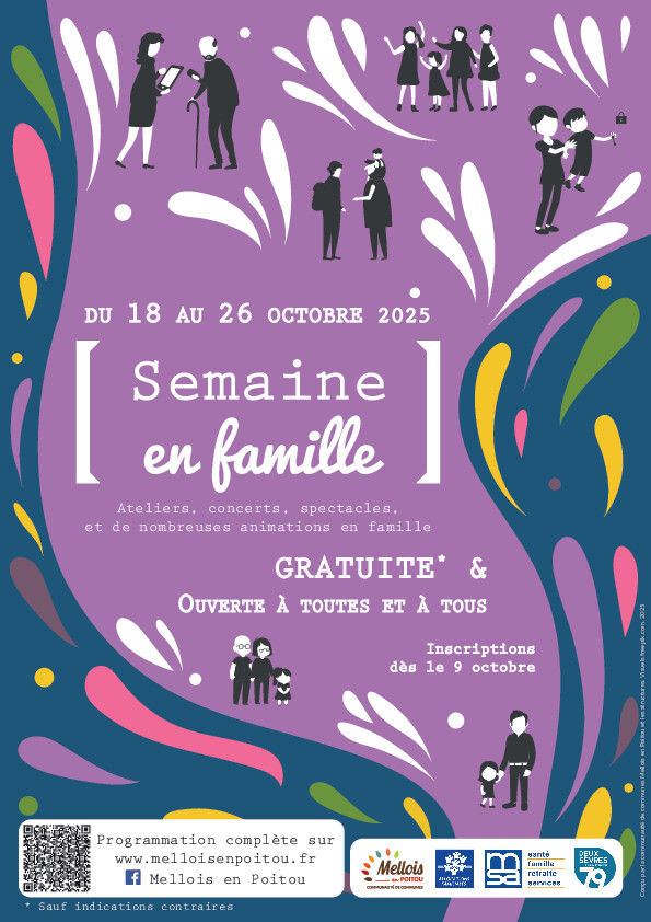Le service petite enfance, enfance, jeunesse de la communauté de communes Mellois en Poitou vous invite à la 8e édition de la [Semaine en famille] du 18 au 26 octobre. L’occasion de prendre le temps de se retrouver en famille et entre amis sur un temps de partage ludique et récréatif en dehors de la maison. Cette année, une trentaine d’animations et ateliers divers et variés vous seront proposés par les structures communautaires, associatives, d’accueil et de loisirs du territoire.