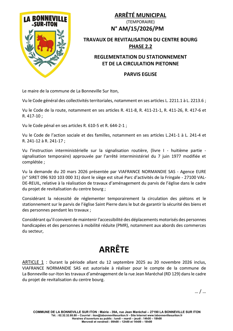 Dans le cadre des travaux de revitalisation du centre bourg, une réglementation de stationnement et de circulation piétonne, via un arrêté municipal, entre en vigueur à compter du 30 mars 2026.