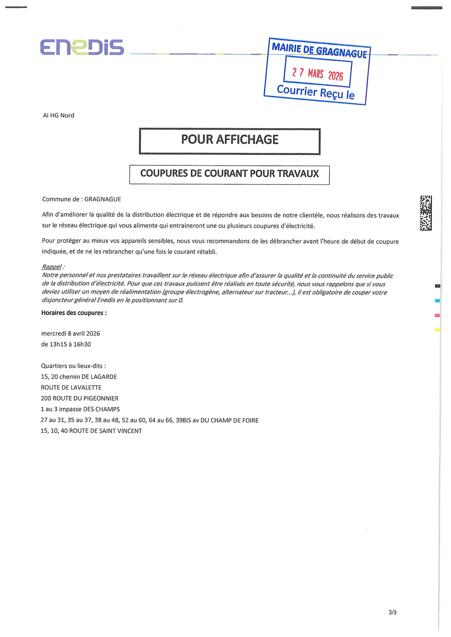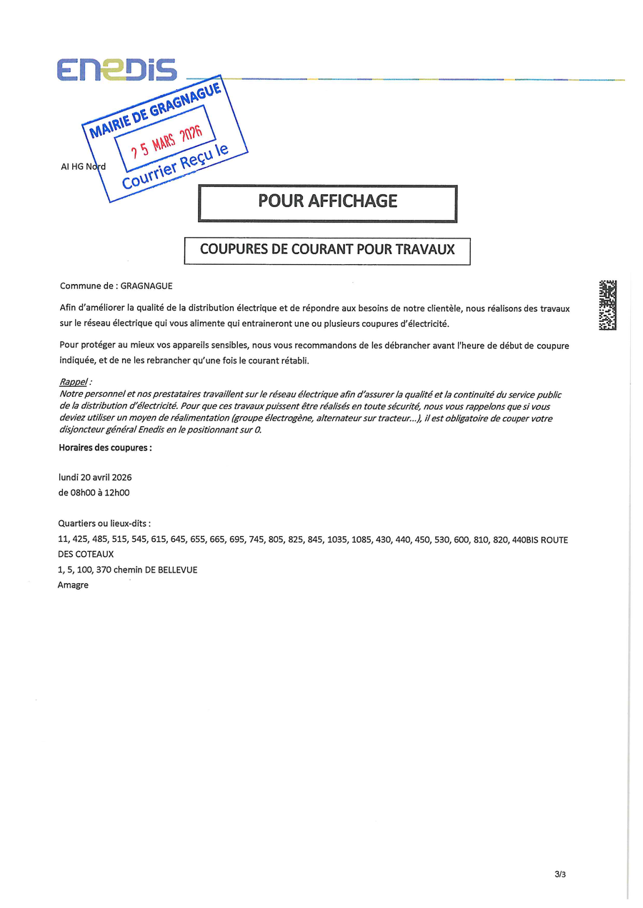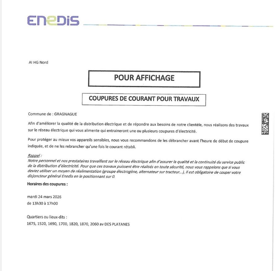 Faisant suite à la communication du 30 janvier 2026 , nous vous informons que la circulation sera interdite à la jonction du chemin de Restes et du chemin des Fusillés du bois de la Reulle, au niveau passage surplombant le ruisseau de Restes, commune de GRAGNAGUE.