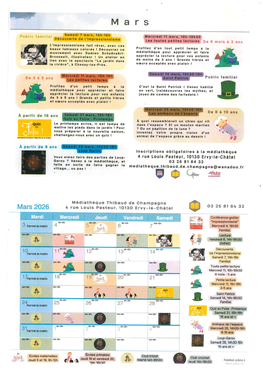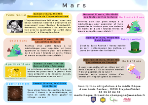 Mars (et les beaux jours) arrivent bientôt,, la Médiathèque Thibaud de Champagne vous propose son calendrier des animations de mars.