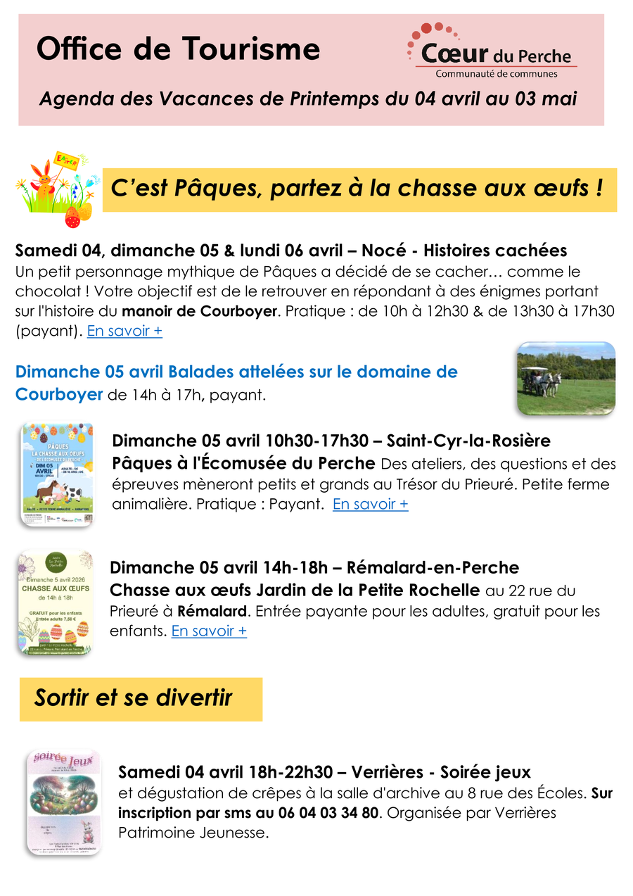 Découvrez vite l'agenda des vacances de printemps dans le Coœur du Perche !