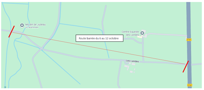 Compte tenu de l'encombrement des engins, la voie communale n° 1 sera interdite à la circulation sur le tronçon qui part de la RD 749 (Les Landes) jusqu'à Ligré (pont de Judeau)