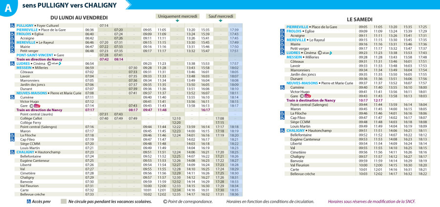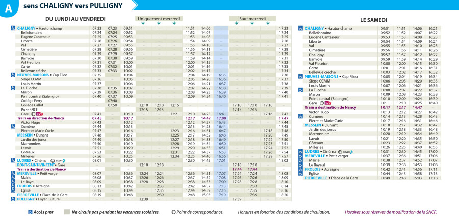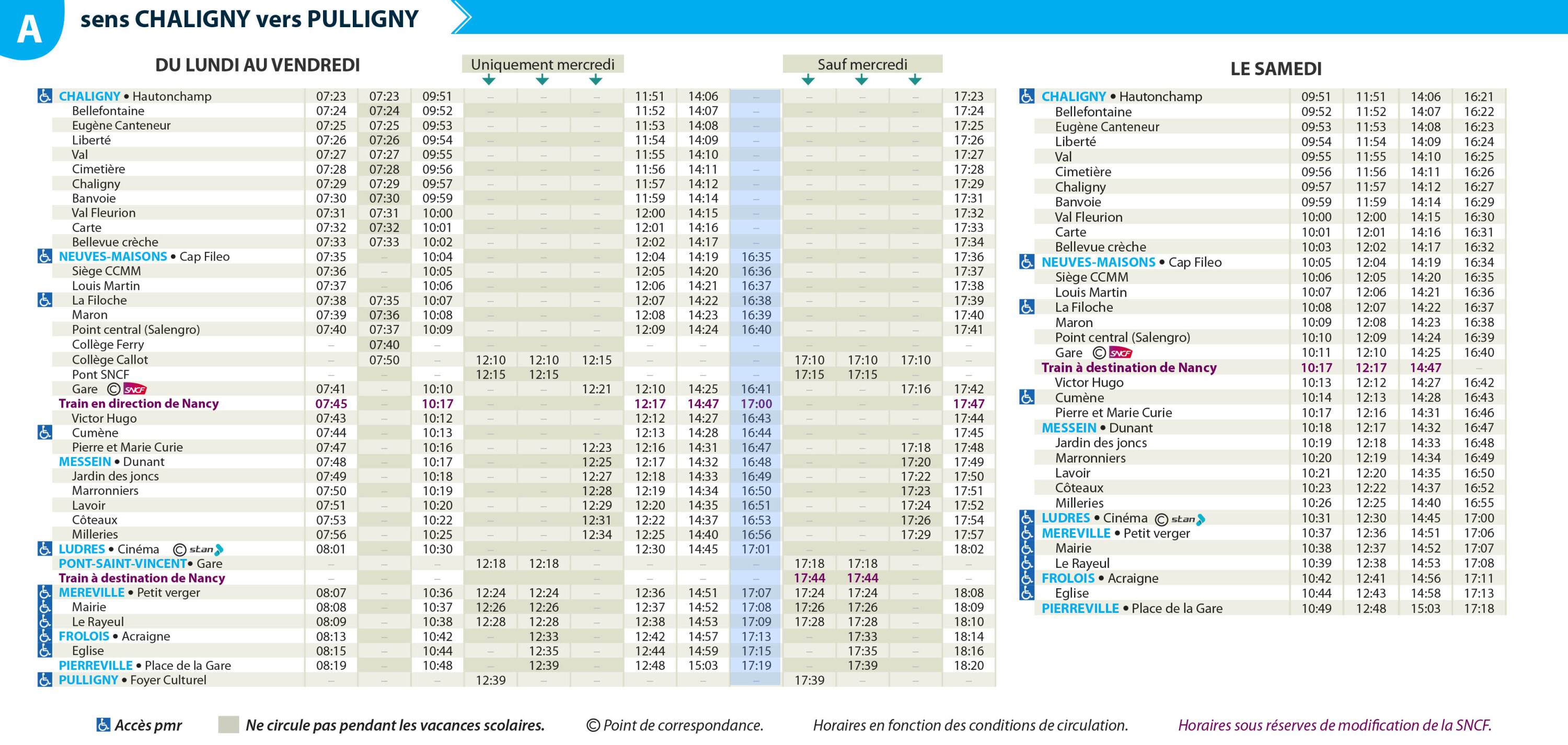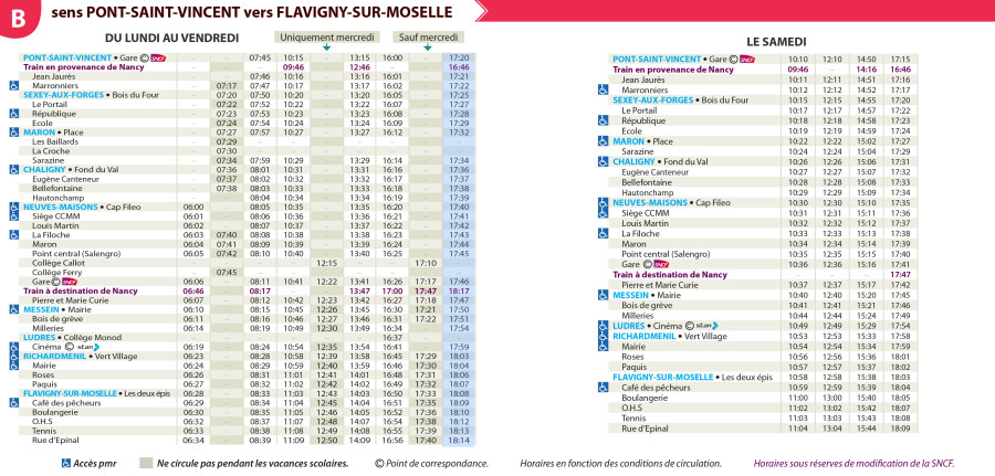 🟦 Les horaires supprimés pendant les vacances ont été colorés en bleu sur les plaquettes horaires ci-dessous :