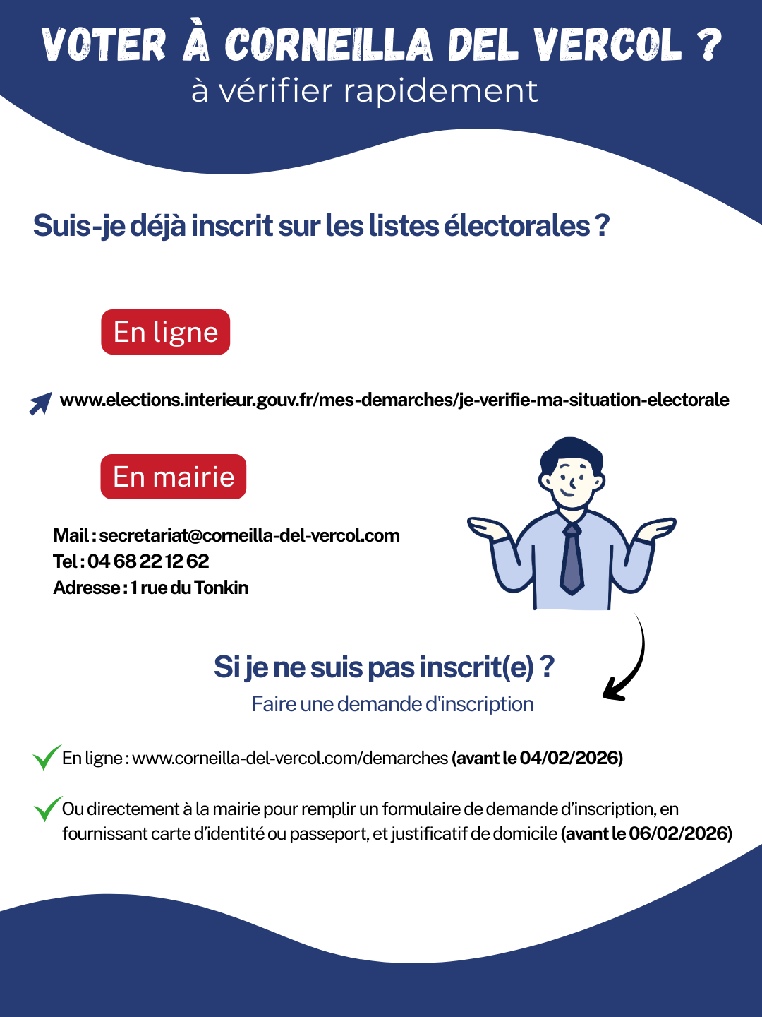 👉 Retrouvez toutes les informations sur ce lien : www.corneilla-del-vercol.com/elections-municipales-2026-inscription-sur-les-listes-electorales/