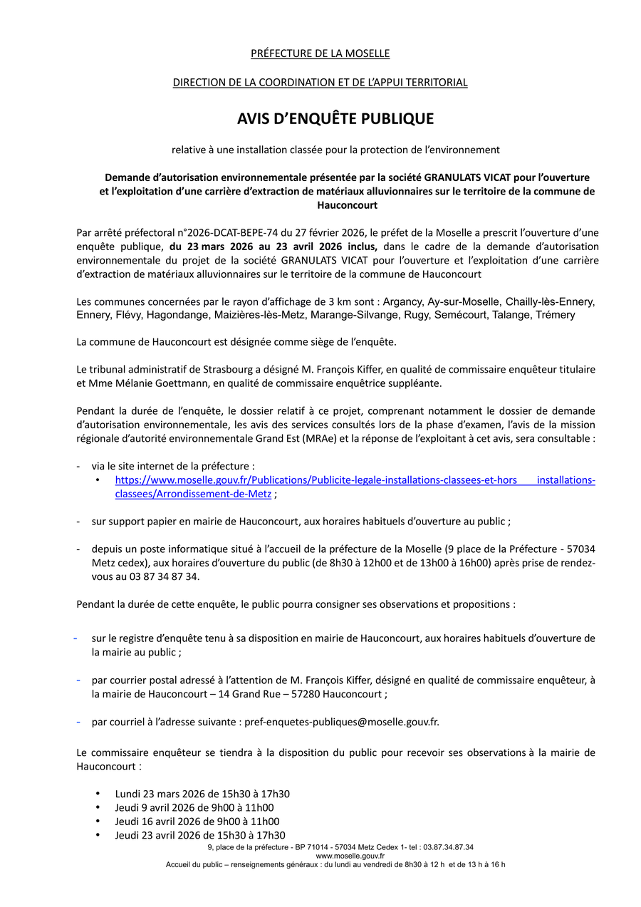 La société GRANULATS VICAT projette l'ouverture te l'exploitation d'une carrière d'extraction de matériaux alluvionnaires sur la commune d'Hauconcourt.