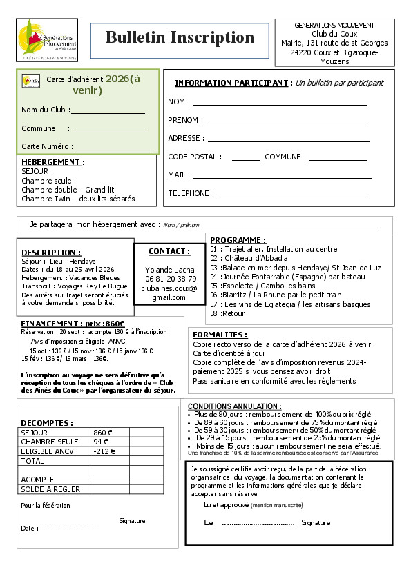 Pour tous renseignements, vous pouvez nous adresser par mail vos questions à «clubaines.coux@gmail.com »,