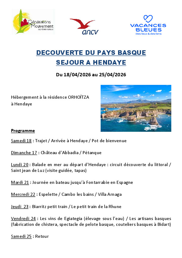 Un programme varié vous attend (Fontarrabie en Espagne, St Jean de Luz, Espelette et ses piments, la villa Arnaga d’Edmond Rostand, l’élevage des vins sous l’eau à Egiategia, Biarritz, le petit train de la Rhune), des soirées animées sont prévues et des repas régionaux.