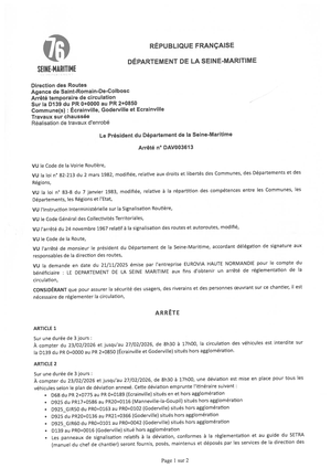 temporaire de circulation sur la Départementale 139 entre Ecrainville et Goderville du 23 au 27/02/2026.