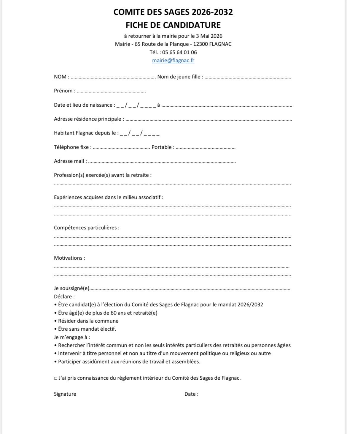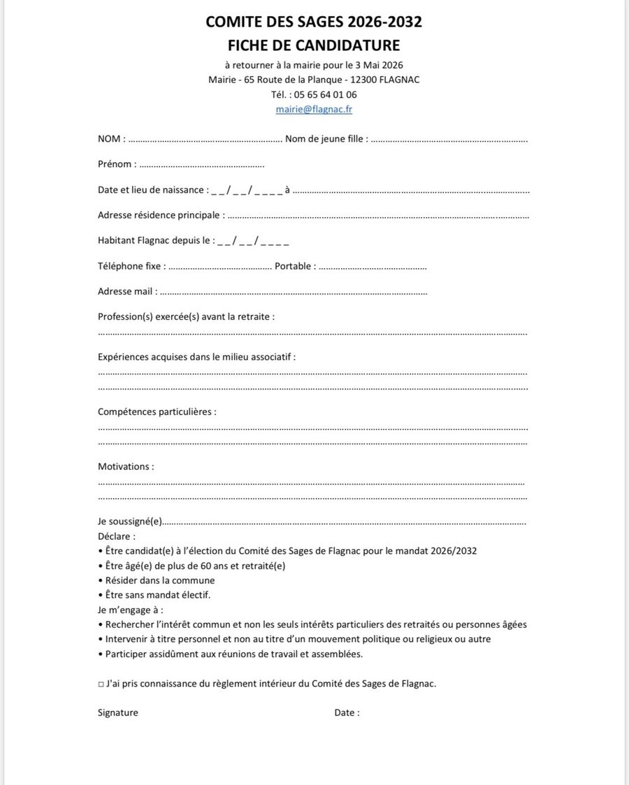Les personnes intéressées sont invitées à se faire connaître en mairie avant le 3 mai 2026 en précisant leurs motivations dans le formulaire de candidature ci dessous