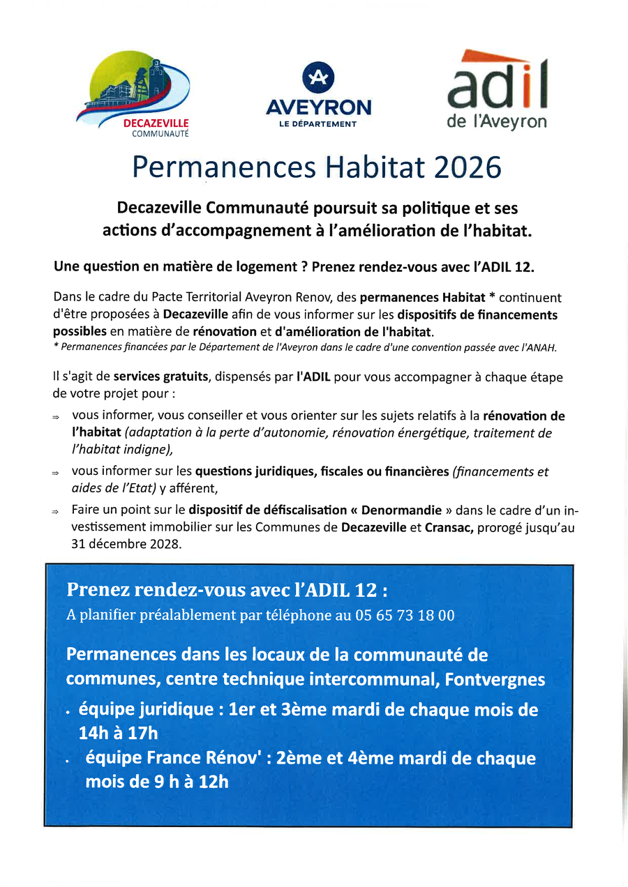 L’ADIL sera ainsi présente chaque semaine à Decazeville selon les modalités suivantes :