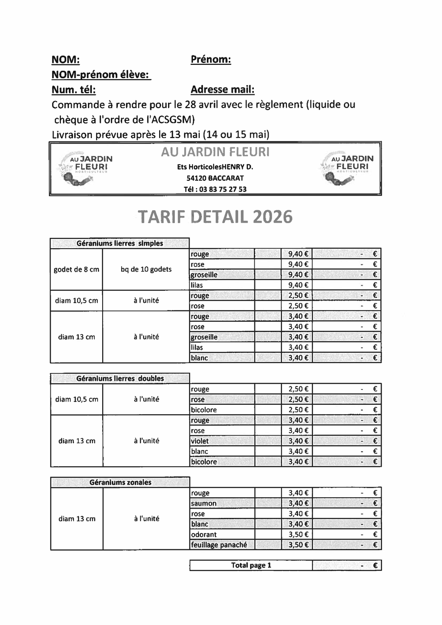 Commandes : Jusqu'au 28 avril (coupon à déposer dans la boîte aux lettres de l'école ou via les élèves).