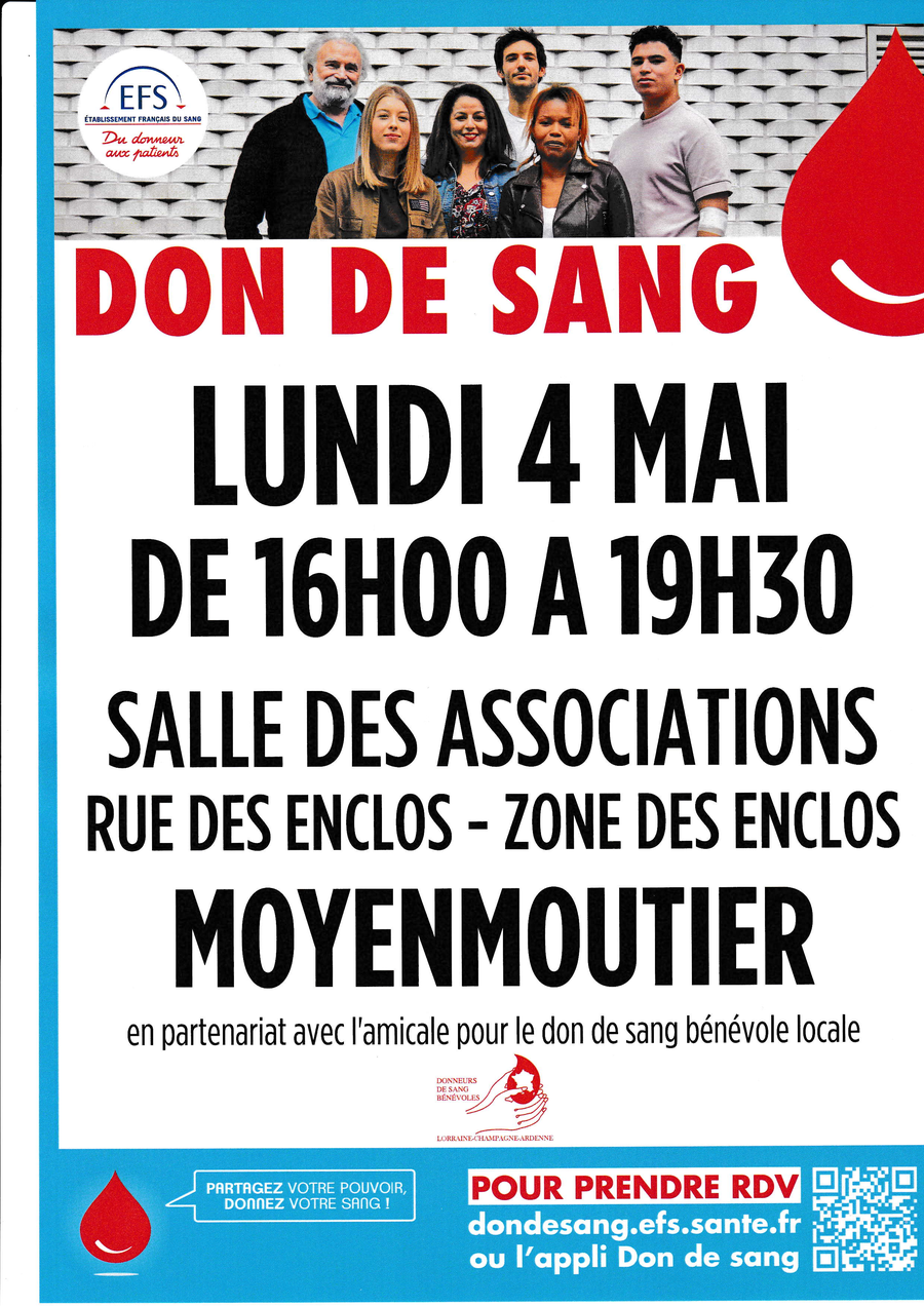 L'Établissement Français du Sang (EFS) , en partenariat avec l'amicale locale des donneurs de sang bénévoles , organise une collecte de sang à Moyenmoutier.