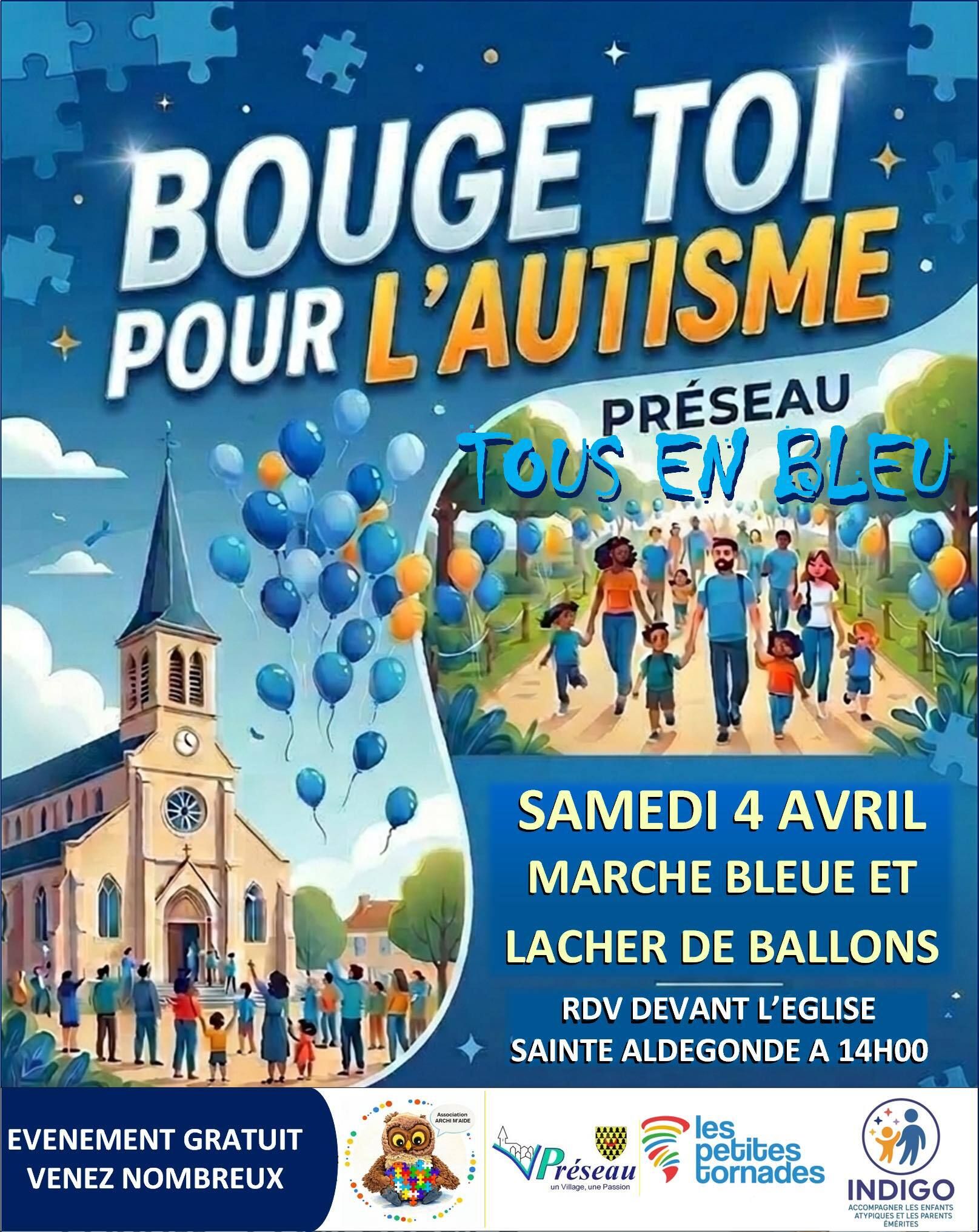 On vous attend nombreux vêtus de bleu. Rendez vous à 14h devant l’église Sainte Aldegonde de Préseau. Venez à cette occasion rencontrer les associations partenaires de l’événement.