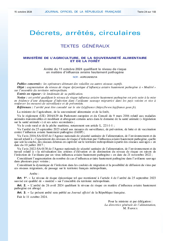 Je vous informe que le niveau de risque épizootique lié à l'influenza aviaire hautement pathogène ( IAHP ) est passé du niveau négligeable au niveau modéré par arrêté du 14/10/2025 paru au Journal Officiel le 15/10/2025, en pièce jointe.