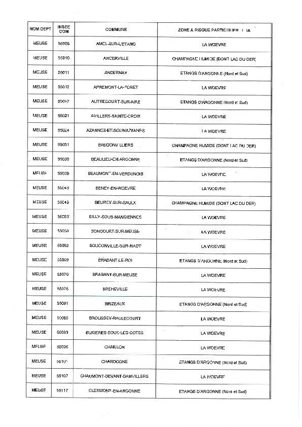 pour le département de la Meuse, dans les communes listées (Cf. liste en pièce jointe : communes de la Woëvre, de la Champagne humide et des étangs d'Argonne) :