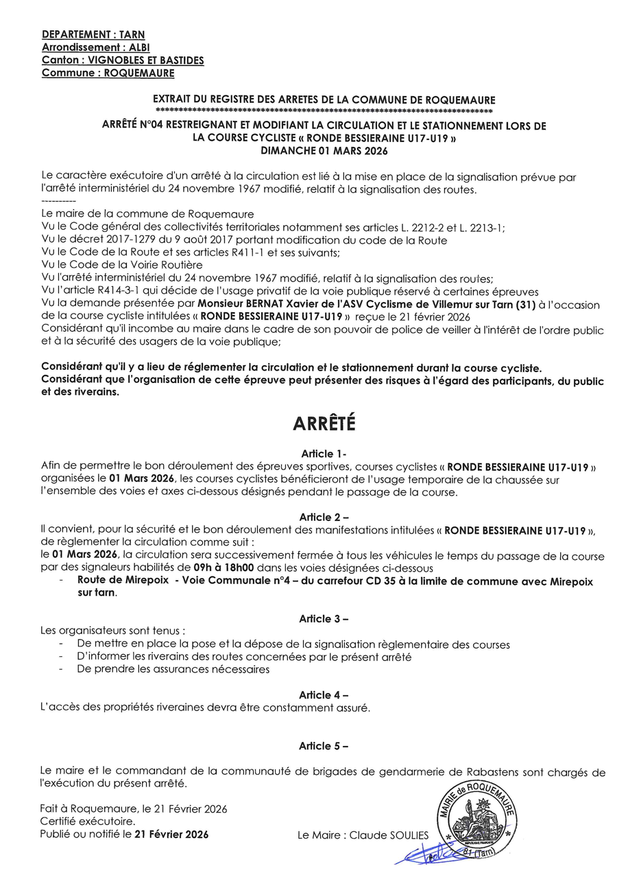 Le dimanche 01 Mars 2026 de 09H à 18H la course cycliste "Ronde Bessiéraine U17-U19 " traversera la commune de Roquemaure.