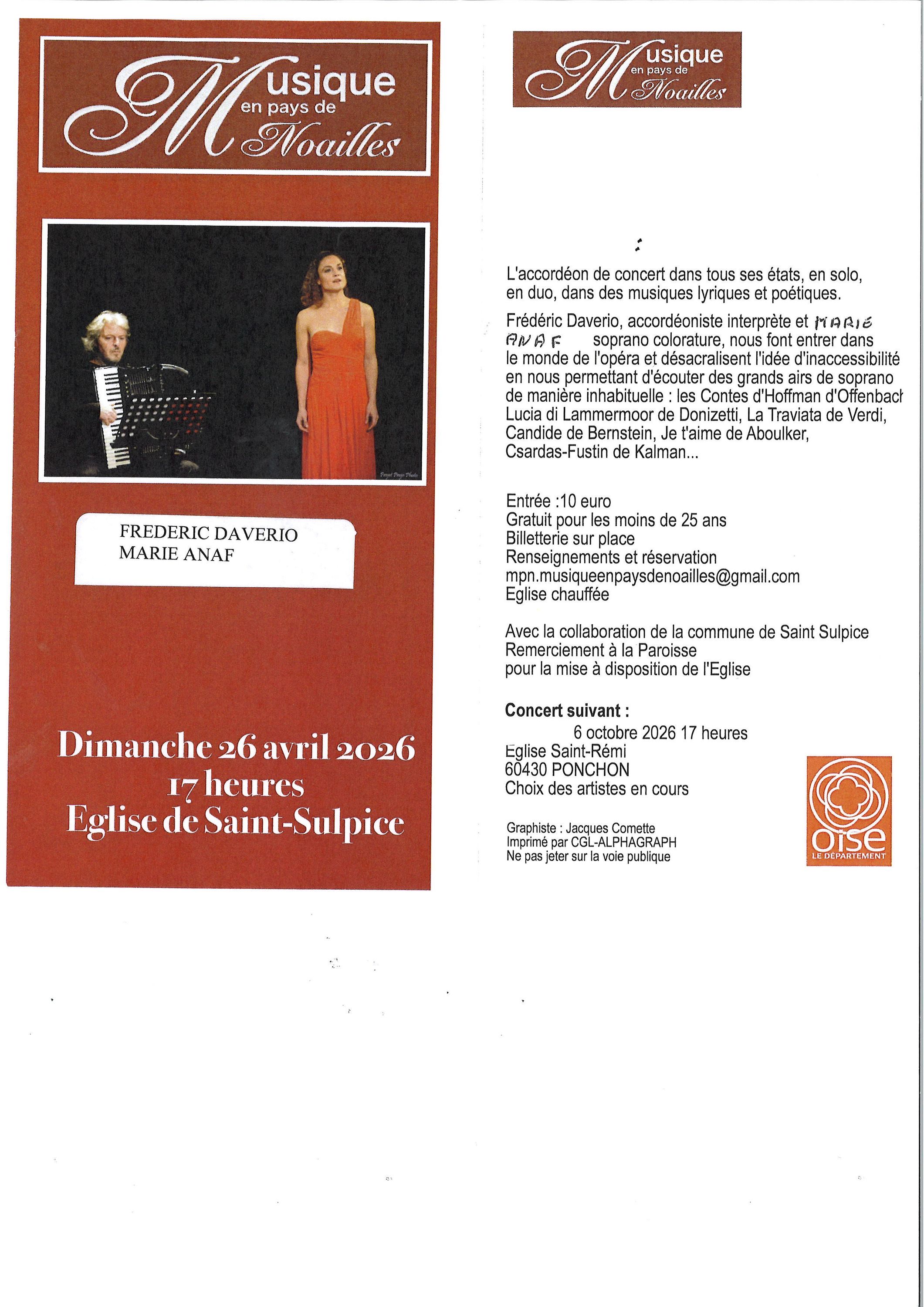 Dimanche 26 avril à 17h, en l’église de Saint-Sulpice, nous aurons le plaisir de vous présenter un duo très inhabituel puisque Frédéric Daverio, à l’accordéon classique et Marie Anaf (changement d’interprète), soprano lyrique et comédienne, vous interprèteront différentes oeuvres en solo et en duo dont de grands airs d'opéra.