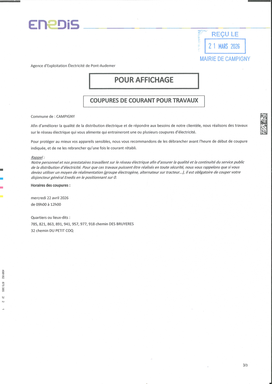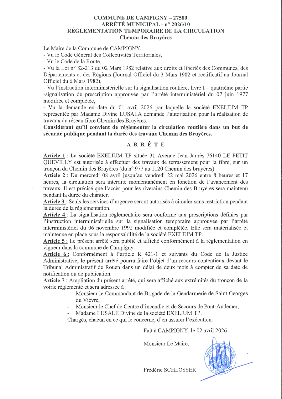 Le démarrage des travaux est prévu à partir du lundi 23 mars 2026 pour une durée de deux mois et demi Route de Pont-Audemer et sur un tronçon du Chemin des Bruyères ( du début du chemin jusqu'à l'intersection avec le Chemin des Roitelets).