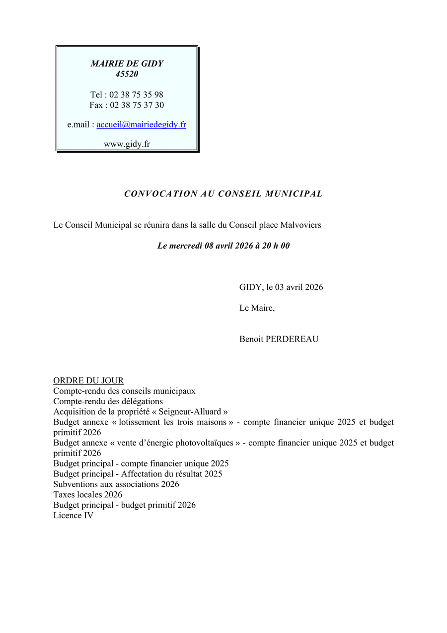 📍 Lieu : Nouvelle salle de Conseil, Rue de Malvoviers, 45520 Gidy