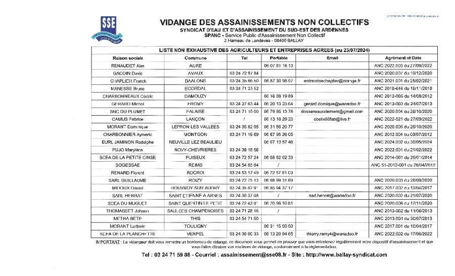 Le Service Public de l'Assainissement Non Collectif (SPANC) du Syndicat d'Eau et d'Assainissement de Ballay va procéder au contrôle périodique des assainissements non collectifs des habitations de Champigneulle, concernées par les contrôles tous les 3 ans.