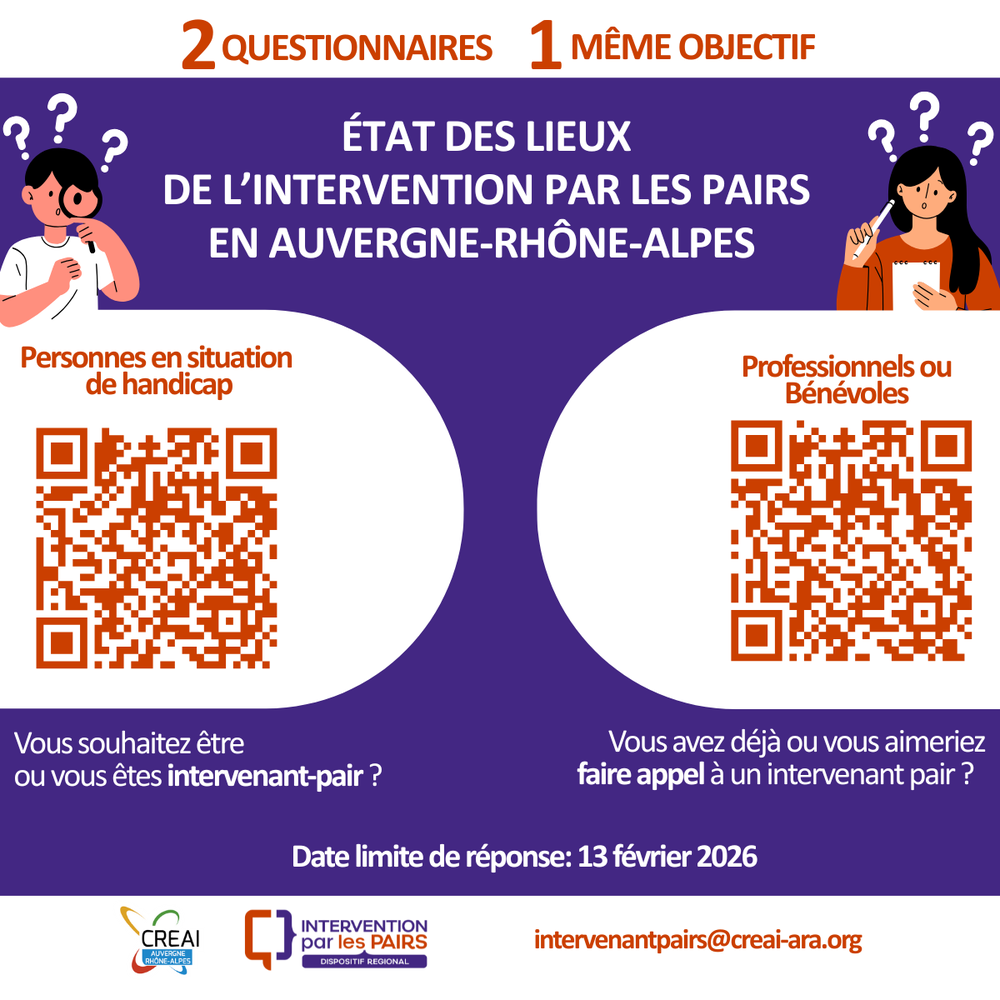 Votre avis est précieux pour faire progresser l’intervention par les pairs dans notre région. Chaque réponse compte et contribuera directement à une meilleure compréhension et au développement de ces pratiques. Nous vous remercions de diffuser largement ce mail auprès de toutes les personnes susceptibles d’être concernées par l’intervention par les pairs. Plus la participation sera large, plus les résultats seront utiles.