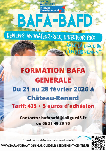 La Ligue de l’Enseignement du Loiret organise prochainement une formation BAFA (Brevet d’Aptitude aux Fonctions d’Animateur) dans les locaux du Pôle Administratif de la 3CBO, à Château-Renard, juste à côté de la piscine.