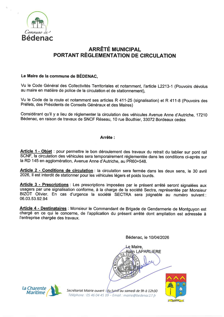 La commune de Bédenac nous informe que la circulation des véhicules sera fermée dans les deux sens, le 30 avril 2026, sur la RD 145, Avenue Anne d'Autriche, pour permettre le bon déroulement des travaux de retrait du tablier sur pont rail.