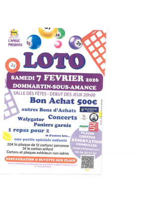 Le samedi 7 février à 20h, l’Association des Parents d'Elèves du Grand Couronné (APEGC), organise dans la salle des fêtes, site de la mairie, un LOTO avec parties enfants.