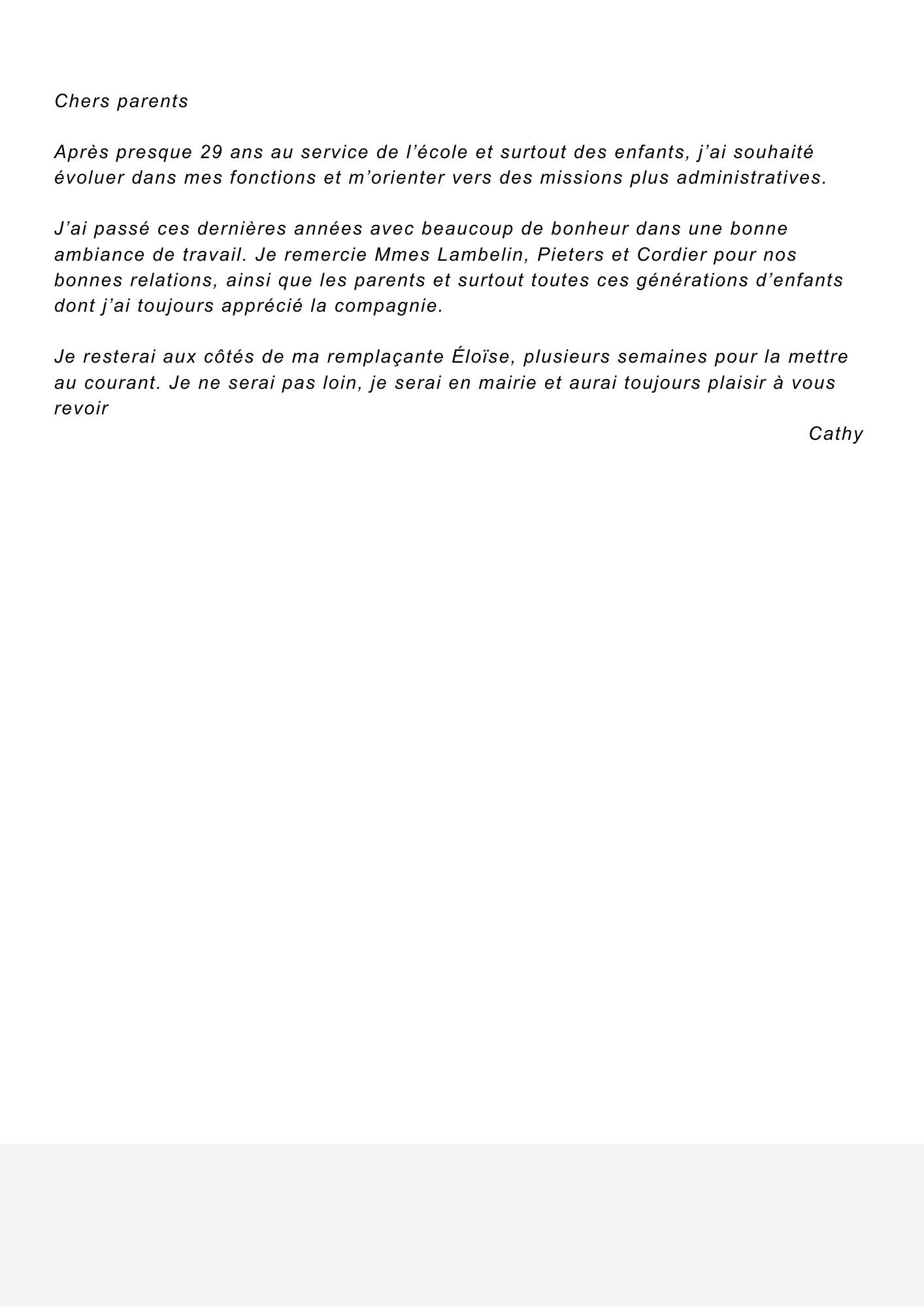 La municipalité informe les parents d’élèves et l’équipe enseignante que Mme Cathy Debrouwer, Atsem à l’école depuis 29 ans, amorce une nouvelle étape dans son parcours professionnel en rejoignant prochainement le service administratif de la mairie.