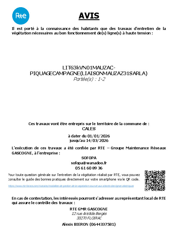 A L'ATTENTION DES HABITANTS DE LA COMMUNE DE CALES