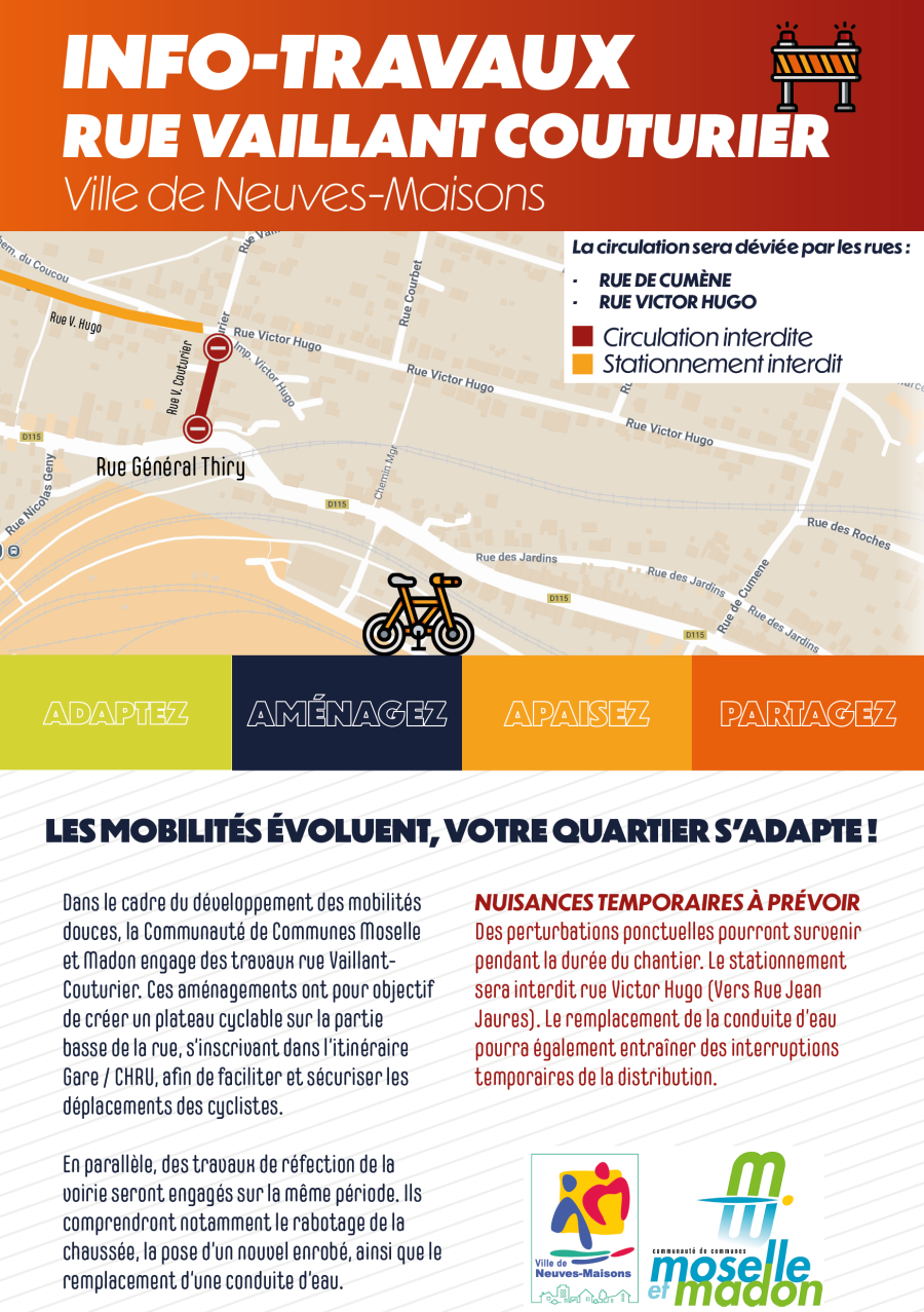 Dans le cadre du développement des mobilités douces, la Communauté de Communes Moselle et Madon lance des travaux rue Vaillant-Couturier. L'Objectif est de créer un plateau cyclable sur la partie basse de la rue, dans le cadre de l’itinéraire Gare / CHRU, afin de sécuriser et faciliter les déplacements des cyclistes