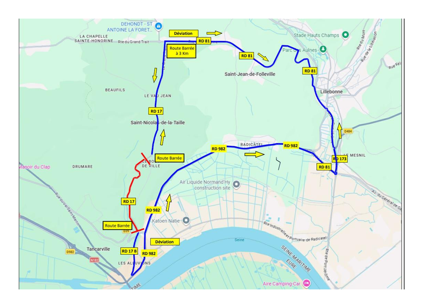 Pendant ces deux autres journée, la RD39 sera barrée au niveau des restaurants de Tancarville ainsi que la partie agglo en direction de la côte de Tancarville.