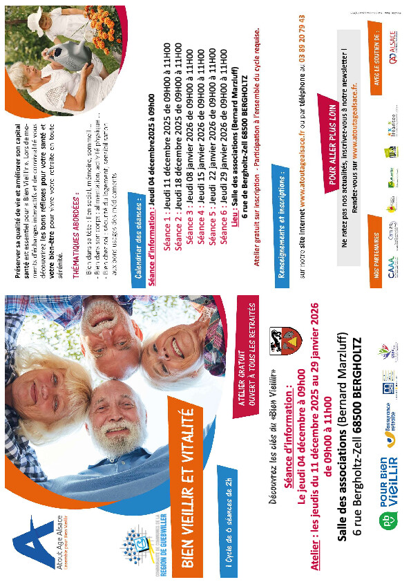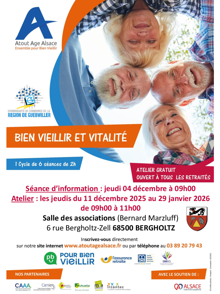 Dans le cadre du Contrat Local de Santé, la Communauté de Communes de la Région de Guebwiller propose en partenariat avec Atout Age Alsace, un atelier à l'attention d'un public retraité sur le thème "Bien vieillir et vitalité"