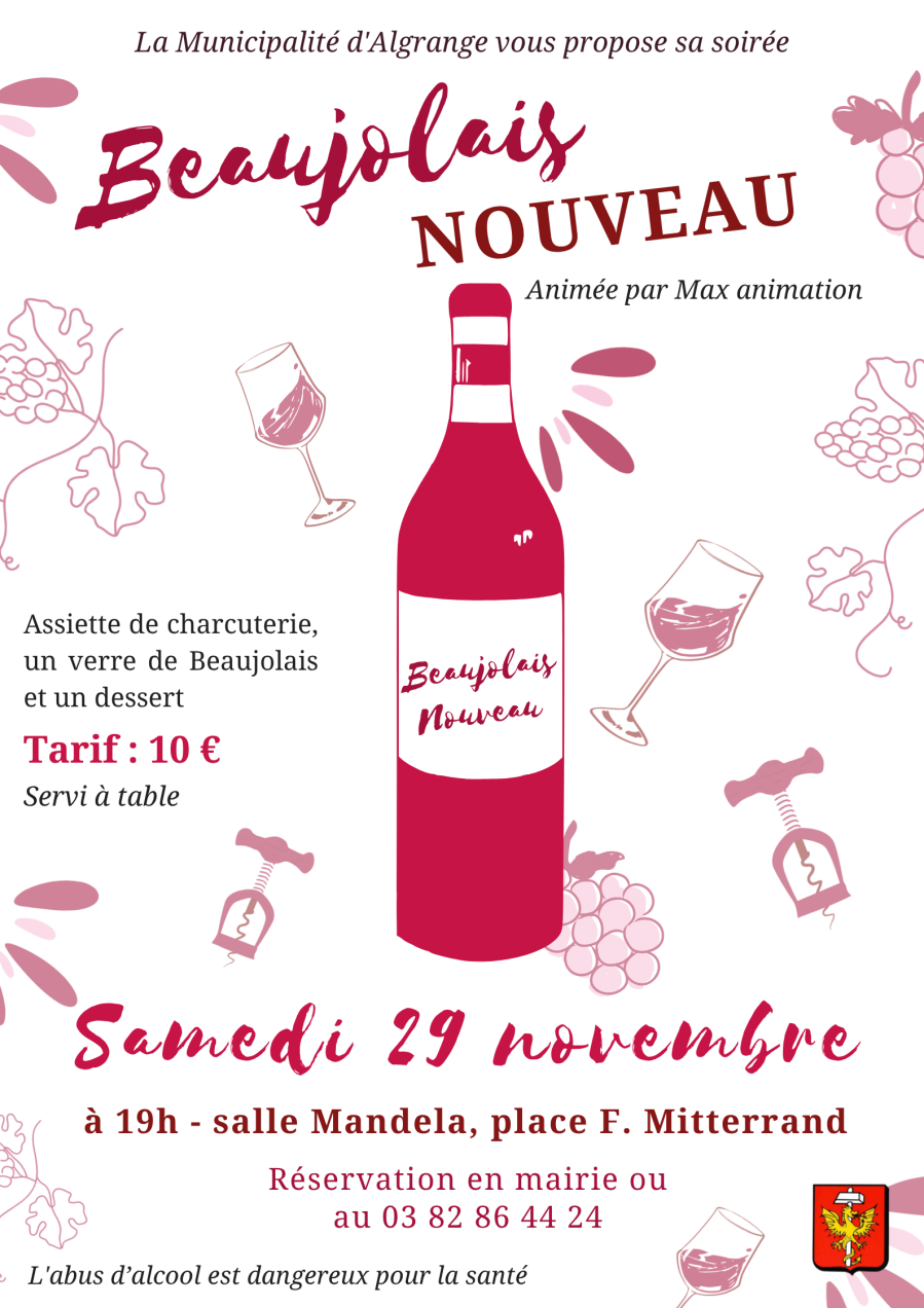 La Municipalité organise sa soirée beaujolais nouveau le samedi 29 novembre à 19h, salle Mandela animée par Max Animation !