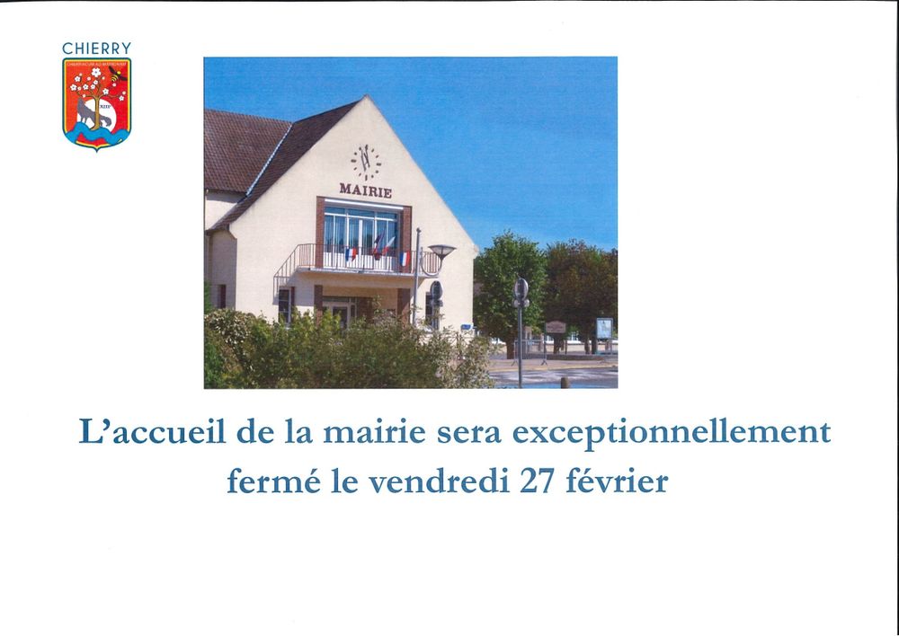 L'accueil de la Mairie sera exceptionnellement fermé le vendredi 27 février