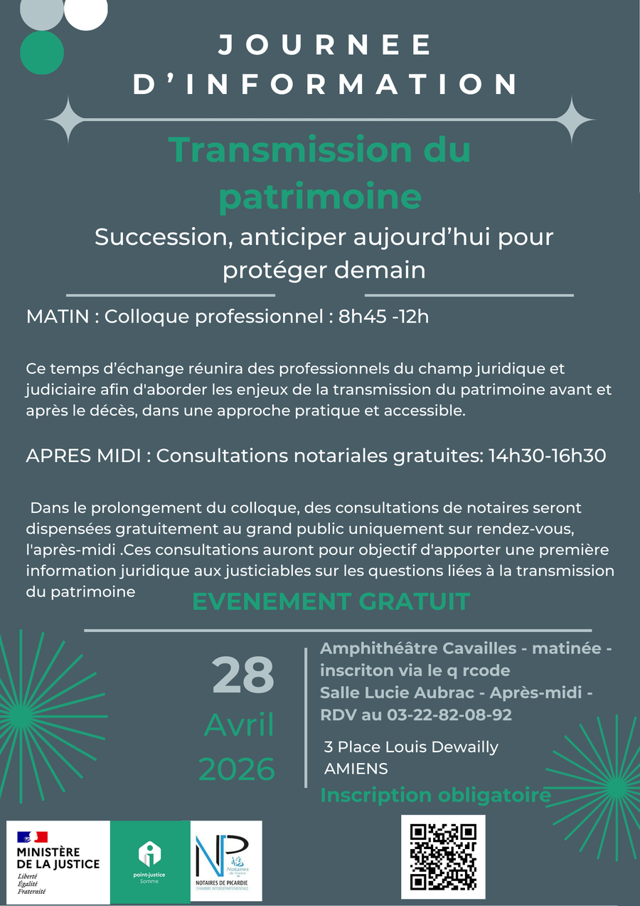 Le Conseil départemental d'accès au droit de la Somme ( CDAD80) et la Chambre Interdépartementale des notaires de Picardie ont le plaisir de vous informer de l'organisation prochaine d'une journée d'information pour les professionnels et le public consacrée à la