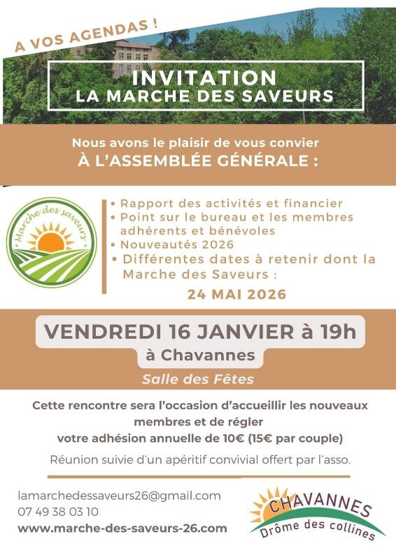 L'association "Chavannes, Drôme des Collines", organisatrice de la Marche des saveurs, vous convie à son Assemblée Générale 2026