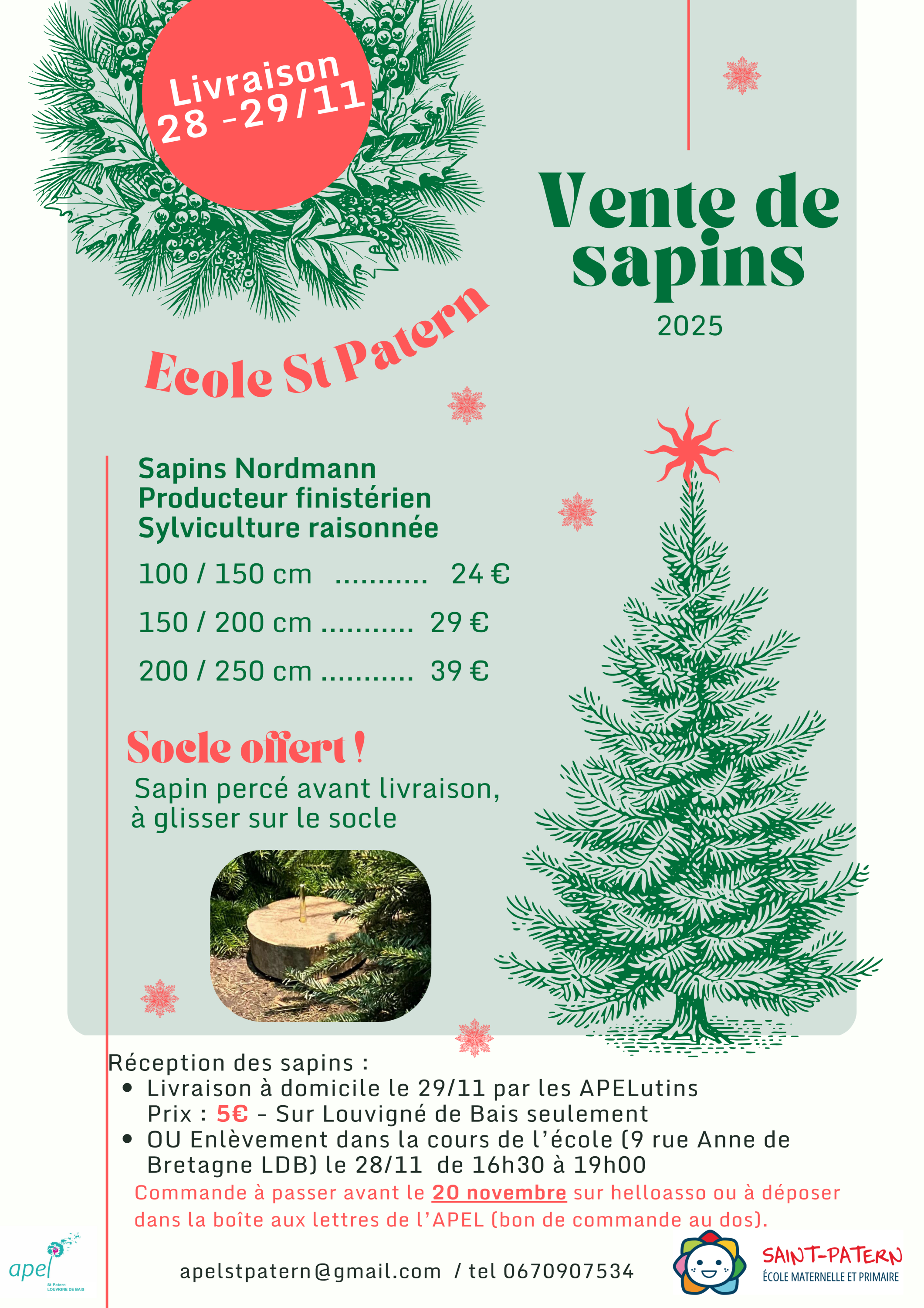 🎄 Vente de sapins de Noël par L'APEL ST Patern, vous pouvez commander soit avec le QR présent sur le bon de commande ou via le lien suivant .