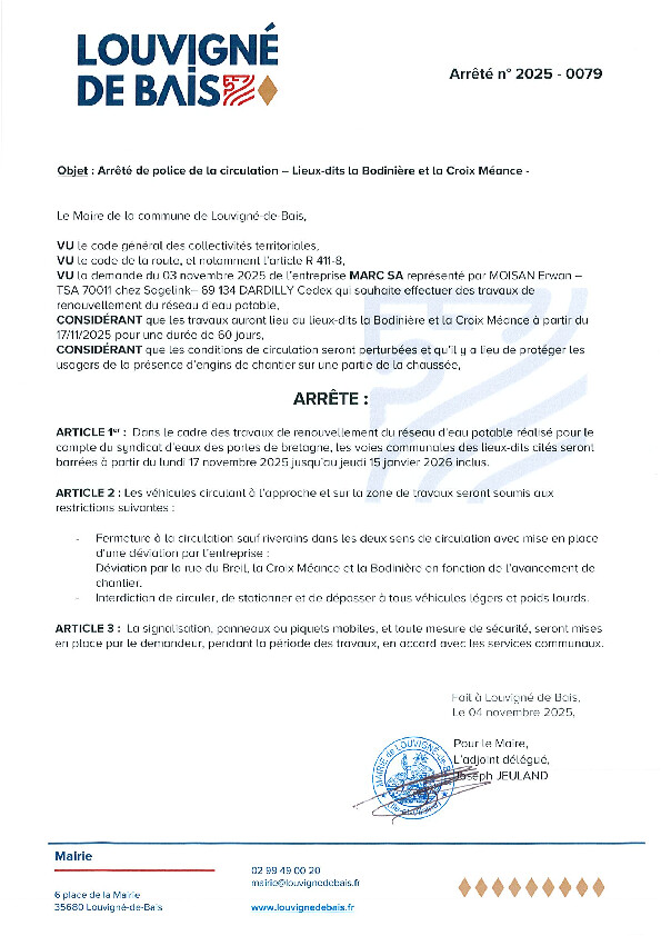 Dans le cadre des travaux de renouvellement du réseau d'eau potable réalisé pour le compte du syndicat d'eaux des portes de bretagne, les voies communales des lieux-dits la Bodinière et la Croix Méance seront barrées à partir du lundi 17 novembre 2025 jusqu’au jeudi 15 janvier 2026 inclus.