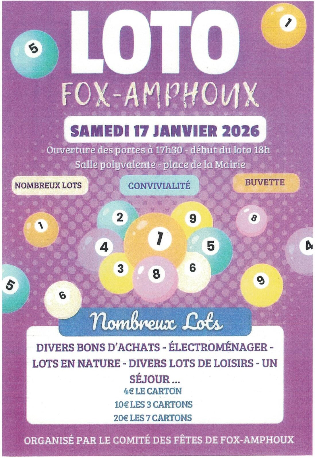 Le samedi 17 janvier 2026 à 17h30, le Comité des Fêtes de Fox-Amphoux organise un loto.