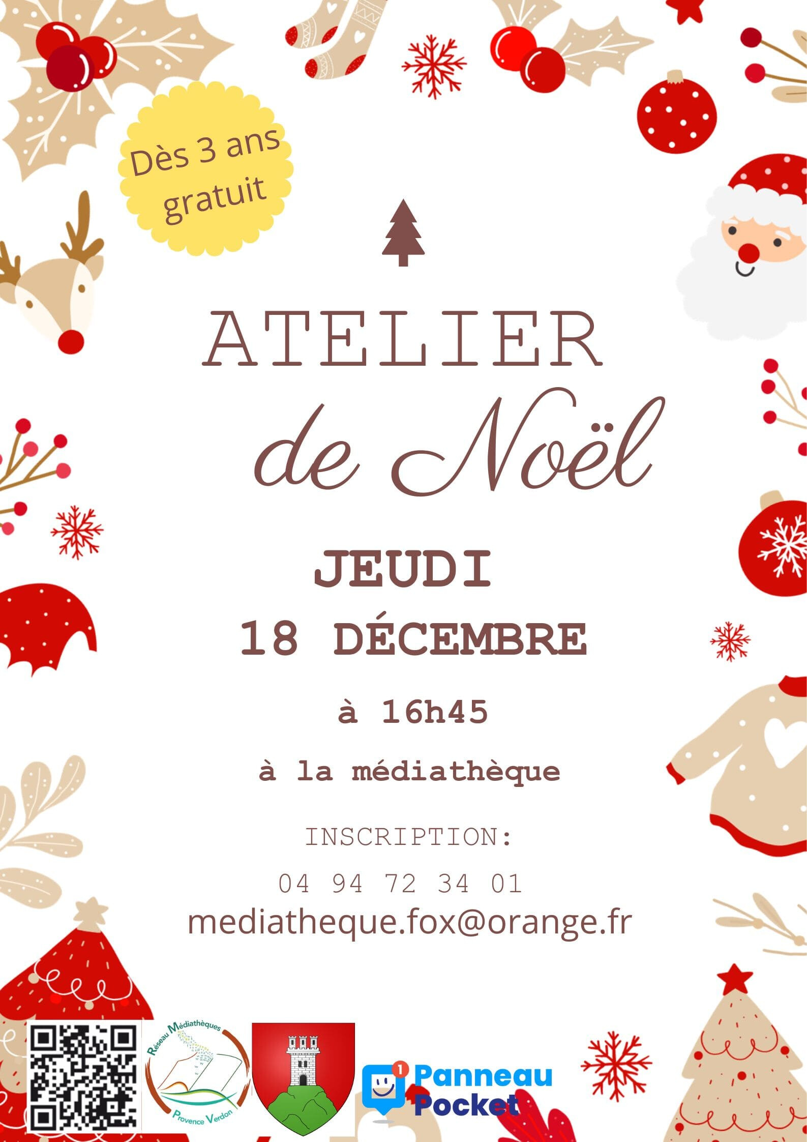 La médiathèque propose à vos enfants un atelier créatif de Noël le jeudi 18 décembre à 16h45 à la médiathèque.