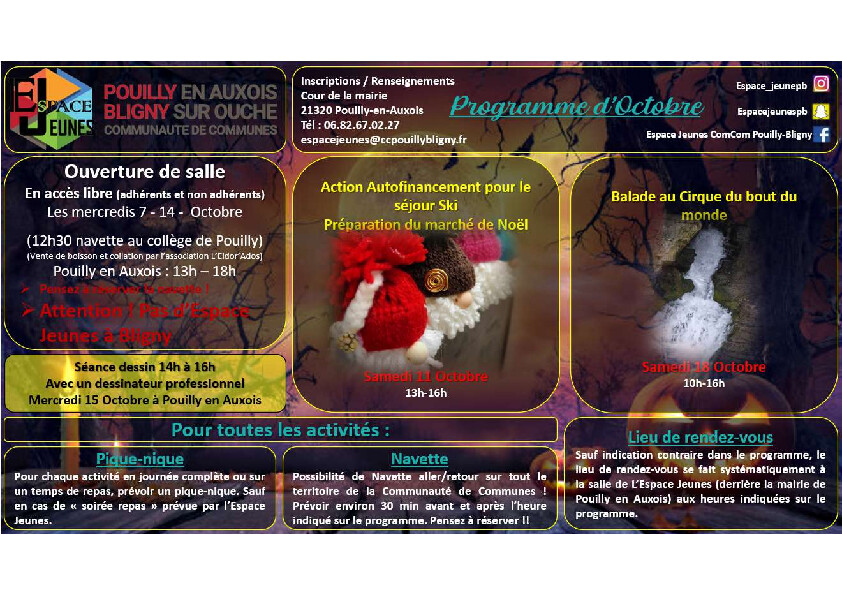 Veuillez trouver ci-joint notre programme d’octobre qui reprend en douceur et notre programme des vacances de la Toussaint.